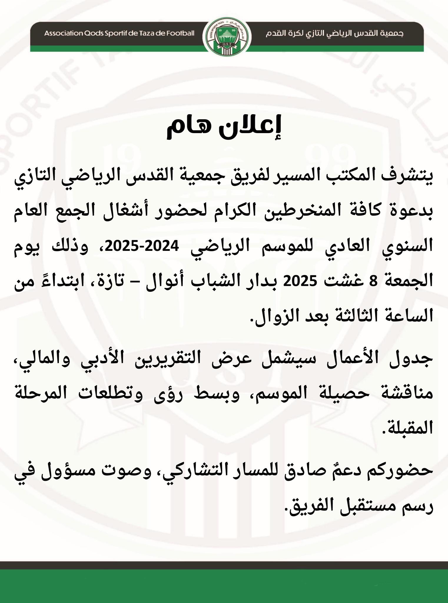ويأتي هذا الموعد في إطار حرص إدارة القدس الرياضي التازي على تعزيز مبدأ الشفافية وتكريس التواصل مع منخرطي النادي، من أجل تقييم الحصيلة السنوية ووضع خطط العمل للموسم الكروي الجديد.