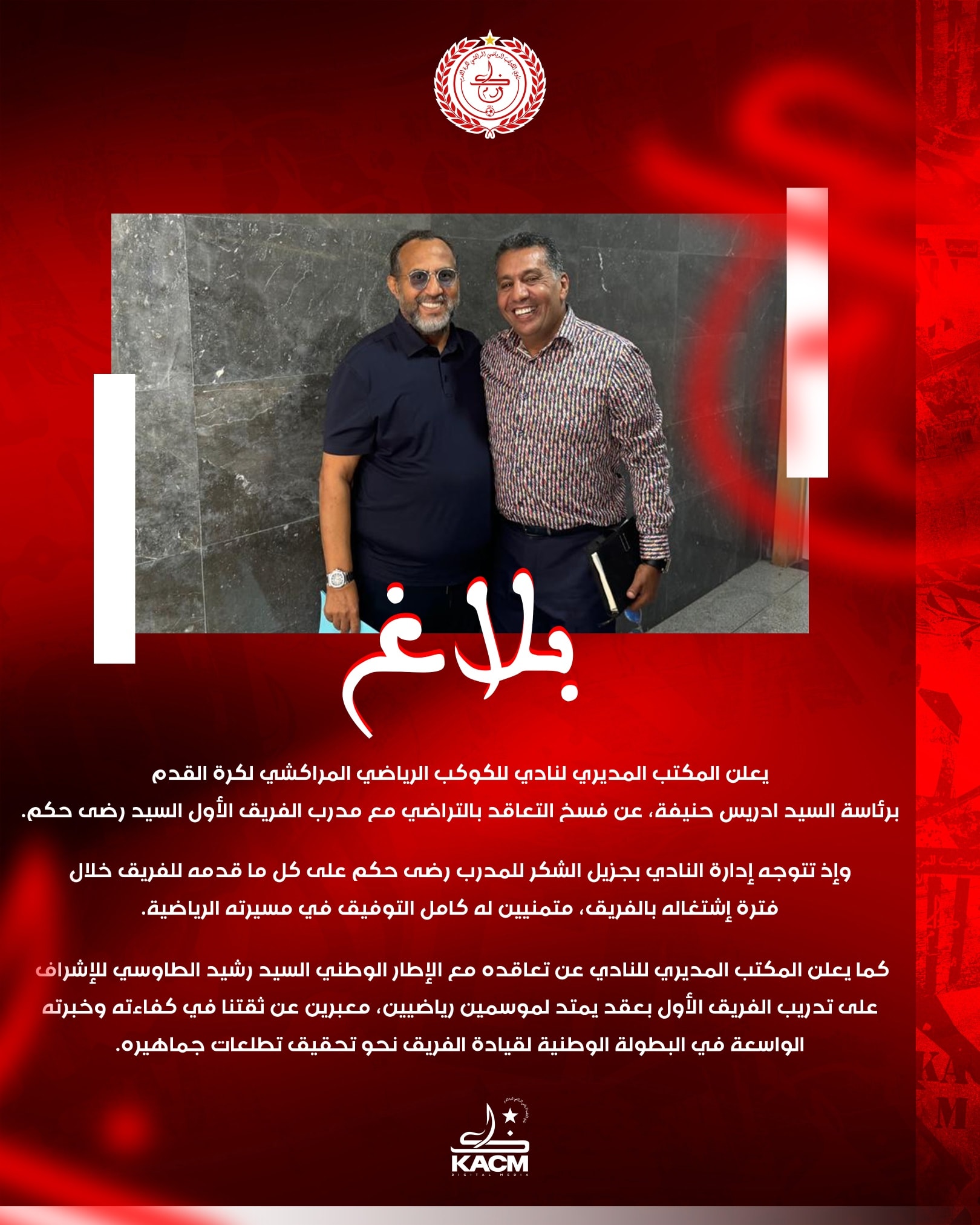 أعلن نادي الكوكب المراكشي عن تعاقده رسميا مع الإطار الوطني رشيد الطاوسي لقيادة الفريق الأول، خلفاً للمدرب رضى حكم، الذي أنهى ارتباطه بالنادي بالتراضي.